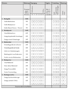 Die Analyse stellt Fragen zu: Marktpotenzial, Marktwachstum, konjunkturellen Schwankungen, saisonale Schwankungen, Verhandlungsstärke der Lieferanten, Verhandlungsstärke der Kunden, Substitutionsgüter, neuen Konkurrenten, Wettbewerbern, relativen Marktanteil.